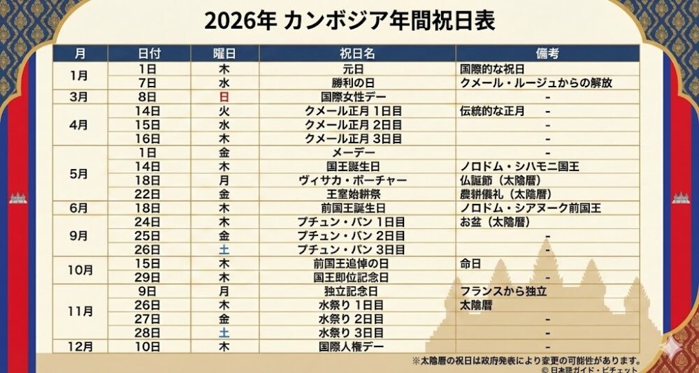 2026年 カンボジア年間祝日表