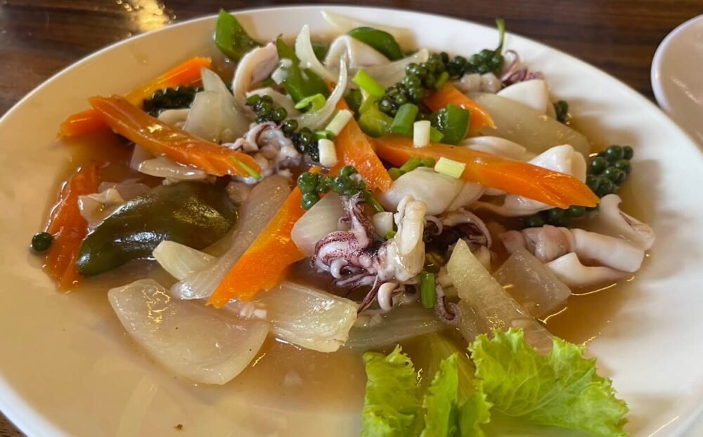 カンボジアの名産地カンポット産の「生胡椒」を房ごと使った贅沢な一品。プチッと弾ける生胡椒の爽やかな辛みと、柔らかいイカの相性が抜群。ビールのおつまみにはこれ以上ない最高の一品です。