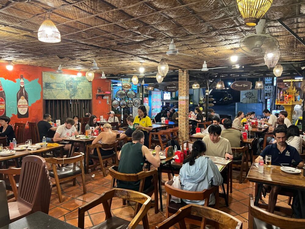 「クメールテイスト」は、単なるレストランという枠を超えて、世界中の旅行者が集まる社交場のような活気があります!