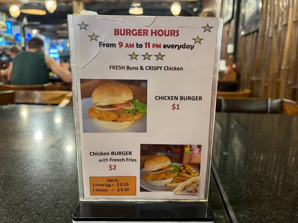 朝9時から夜の11時までチキンバーガーが1ドルと激安で提供されています!お味は値段相応ですが!!